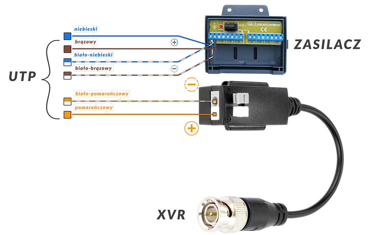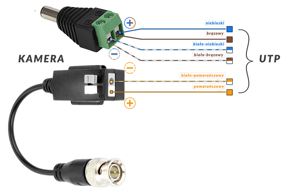 Schema del collegamento a doppino della telecamera AHD CVI TVI con convertitore UTP-BNC e connettore di alimentazione