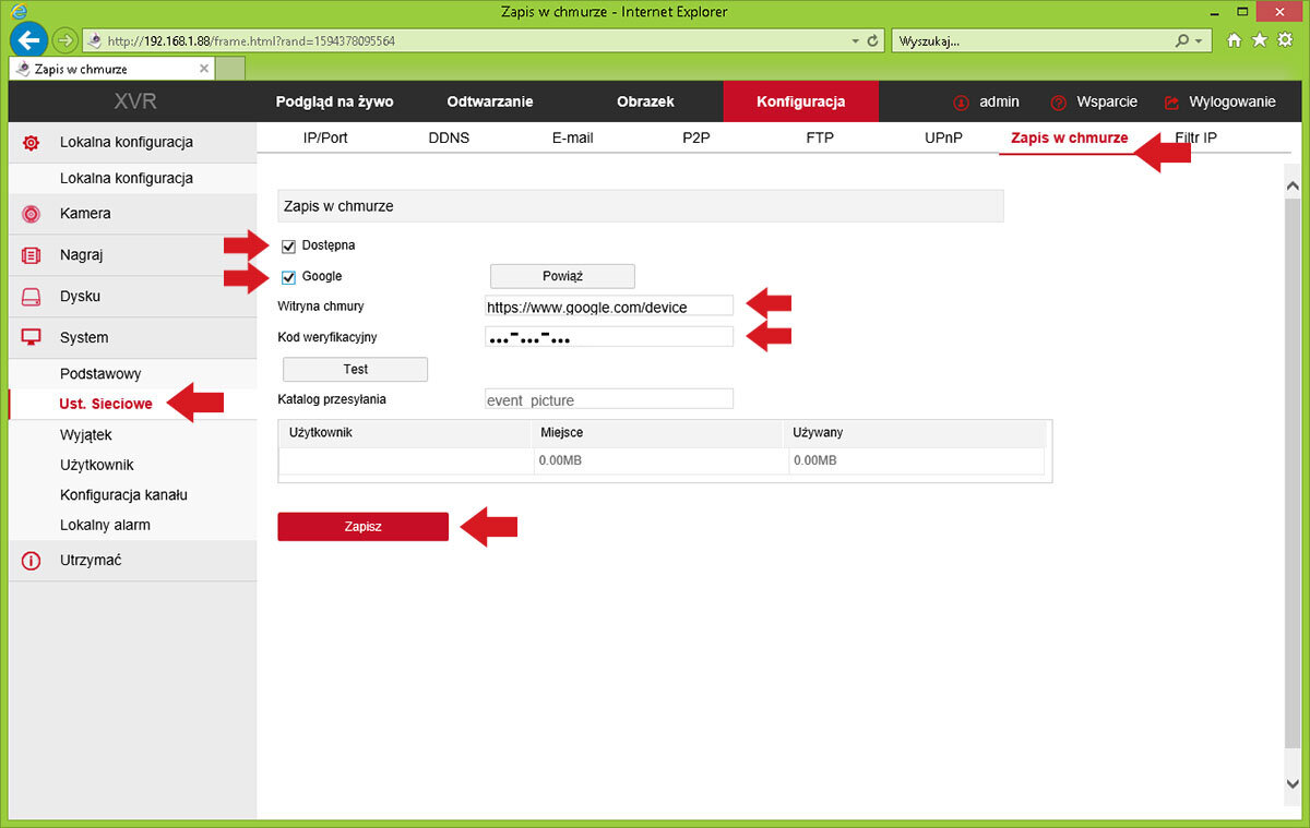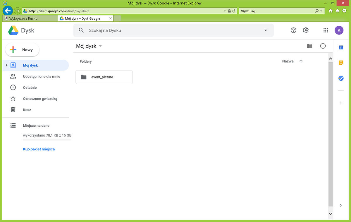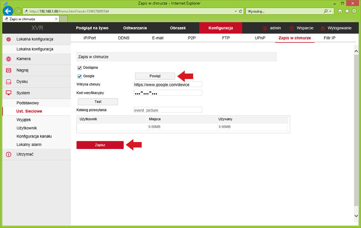 Abilitare il rilevamento del movimento; questa funzione è necessaria per inviare le foto dopo il rilevamento a Google Drive. Accedere alla scheda Configurazione / Rilevamento del movimento. Fare clic sulla casella di controllo accanto a disponibile, per abilitare il rilevamento del movimento (la registrazione o l'invio di e-mail dopo il rilevamento può essere abilitata nel rilevamento del movimento). Salvare le modifiche
