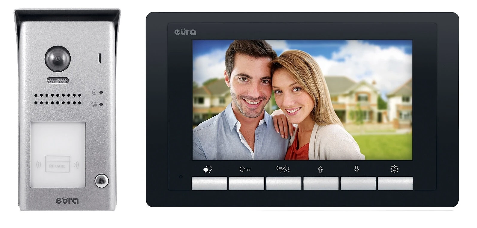 Il videocitofono a 2 fili Eura 2 Easy è un sistema mono o plurifamiliare. L'idea principale è la semplicità di installazione ottenuta riducendo al minimo il numero di cavi e di alimentatori. Per collegare i singoli moduli funzionanti nel sistema, sono sufficienti un cavo di comunicazione a 2 fili e un alimentatore con il separatore VZA-59A5, che è parte integrante del set. Il videocitofono monofamiliare VDP-61A5/N della serie Eura 2 Easy è un dispositivo che effettua il controllo degli accessi all'area di ingresso della proprietà. Il videocitofono consente di stabilire un collegamento bidirezionale con il chiamante e di sbloccare il blocco elettromagnetico posto sul cancello. La cassetta esterna è dotata di un lettore di schede di prossimità e di portachiavi, utilizzato per aprire l'ingresso ai locali. La trasmissione del segnale video è affidata a una telecamera a colori grandangolare, mentre l'osservazione al crepuscolo è favorita da un set di 3 LED a luce bianca con sensore crepuscolare incorporato. Il monitor videocitofonico ultrasottile a mani libere con schermo da 7" è dotato di un menu di testo in polacco. Il dispositivo è dotato di tasti funzione sensibili al tocco, posti sotto lo schermo, grazie ai quali è possibile azionare direttamente 2 serrature elettromagnetiche indipendenti.